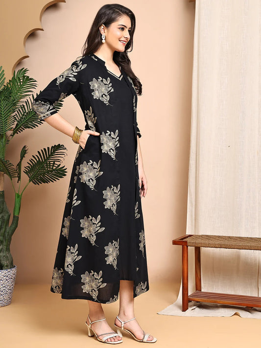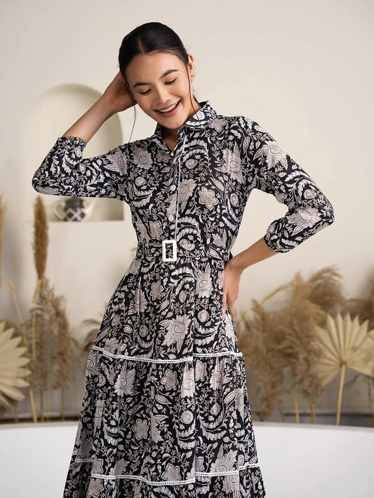 Women's Black Crush Crepe Printed Fit and Flare Western Dress
