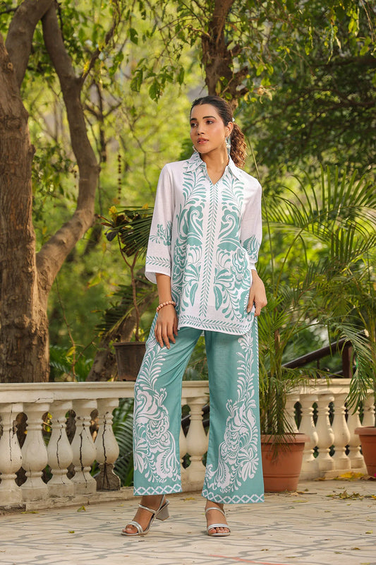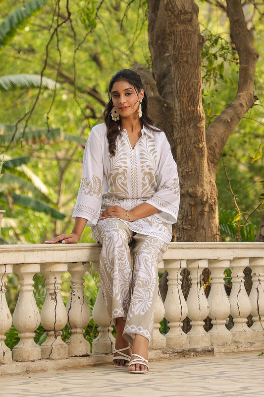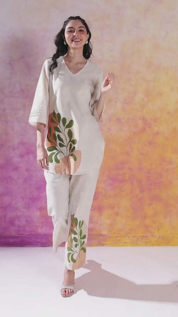 Leafs Printed Off-White Cotton Flex Co-ord Set