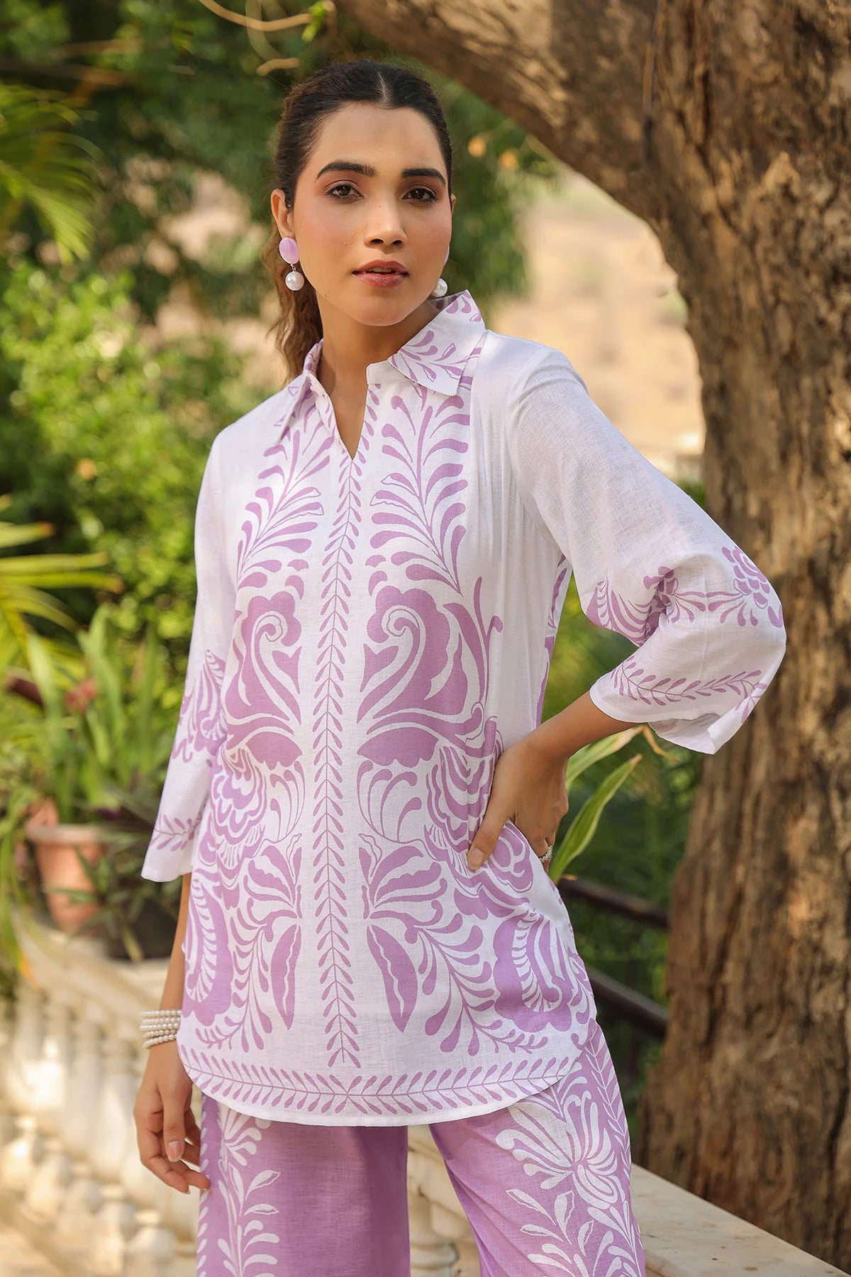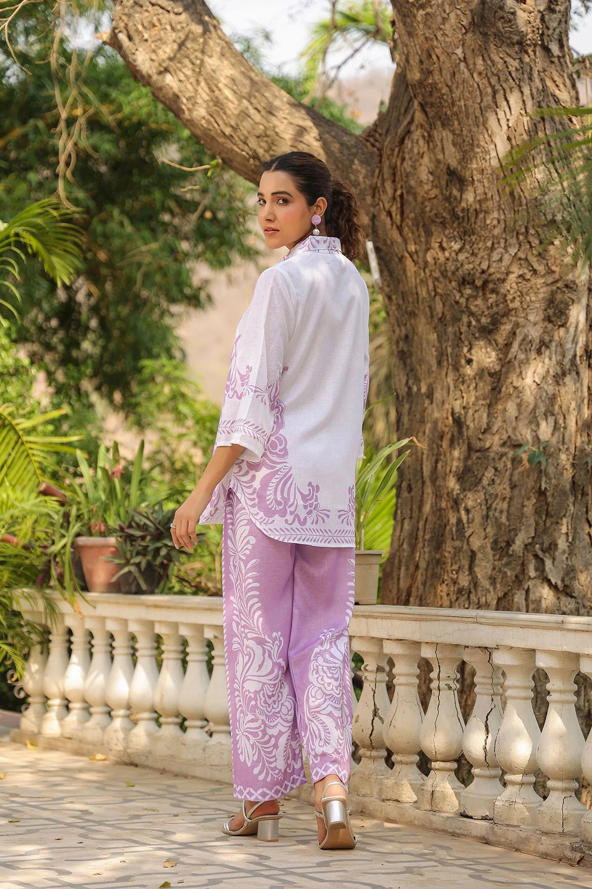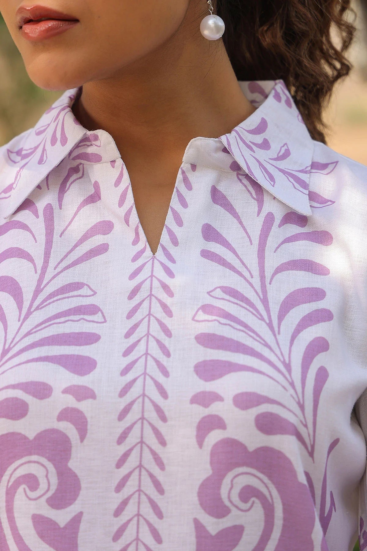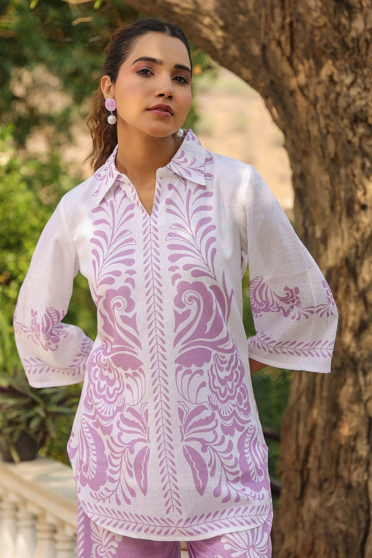 Suchita Jannat March 2024Verified BuyerObsessed with the PrintThe small floral and geometric prints are exquisite. It has a wonderful, handcrafted feel. I especially appreciate the small tassel and bead details on the neck—it makes jewelry optional!Lavender Linen Printed Co-Ord Set Was this helpful? 0 0