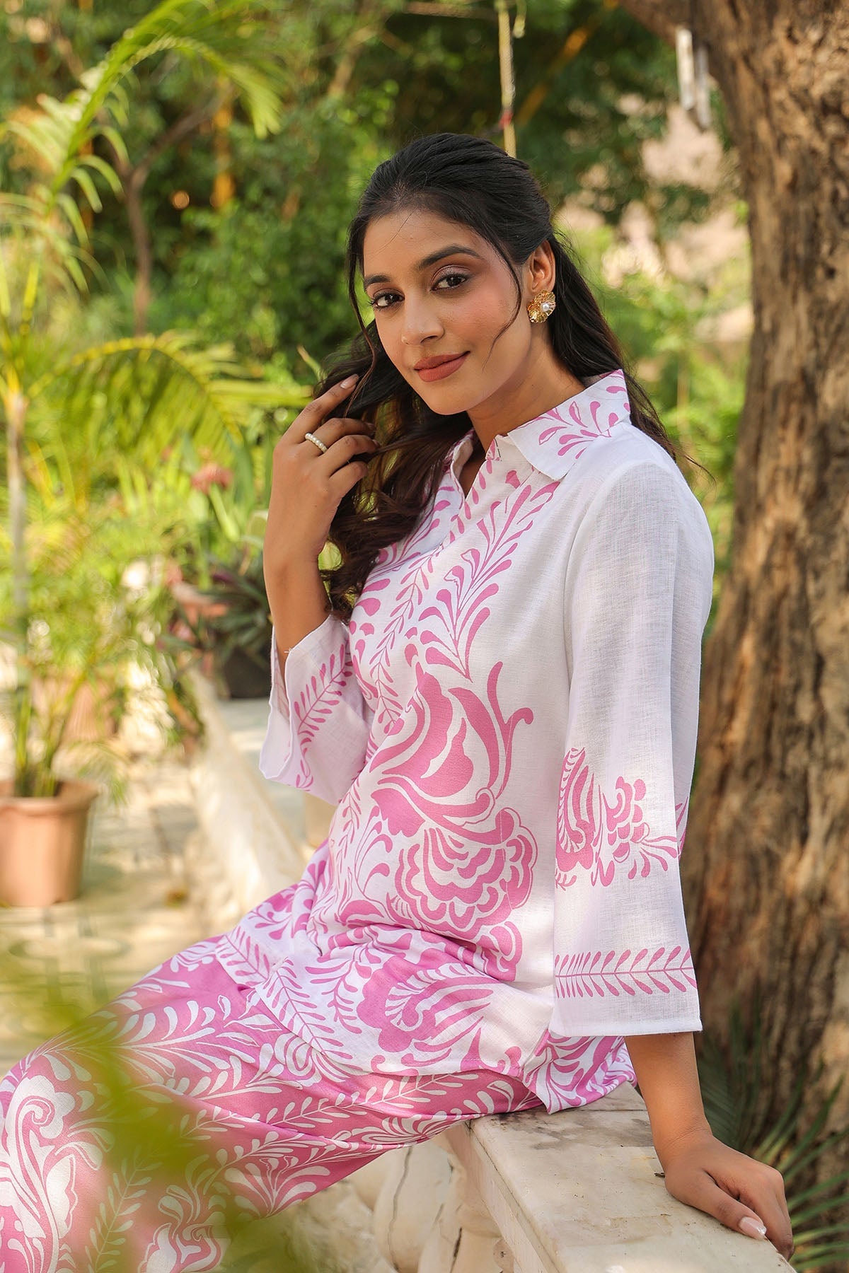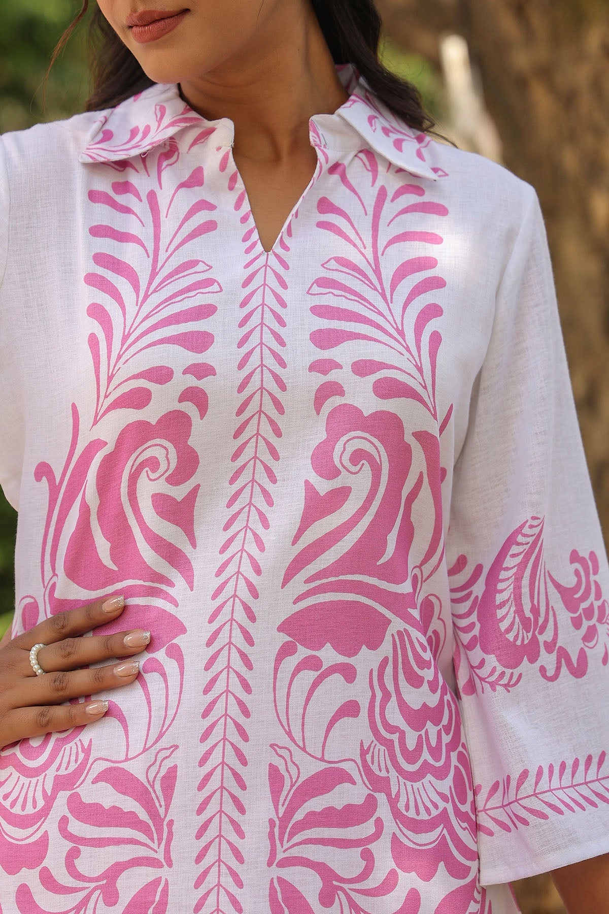 Suchita Jannat March 2024Verified BuyerObsessed with the PrintThe small floral and geometric prints are exquisite. It has a wonderful, handcrafted feel. I especially appreciate the small tassel and bead details on the neck—it makes jewelry optional!Pink Linen Printed Co-Ord Set Was this helpful? 0 0